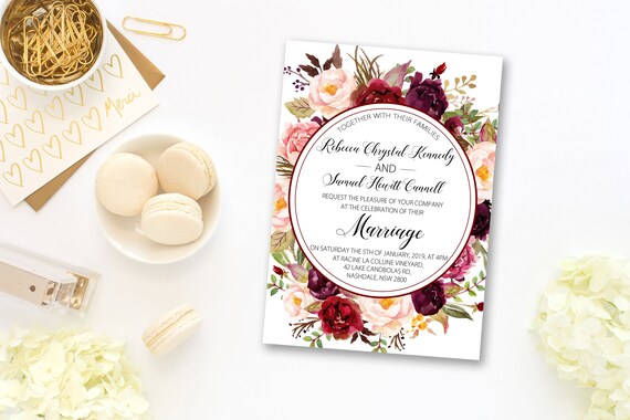 Wedding Invitation Printable Floral Marsala Burgundy Pink